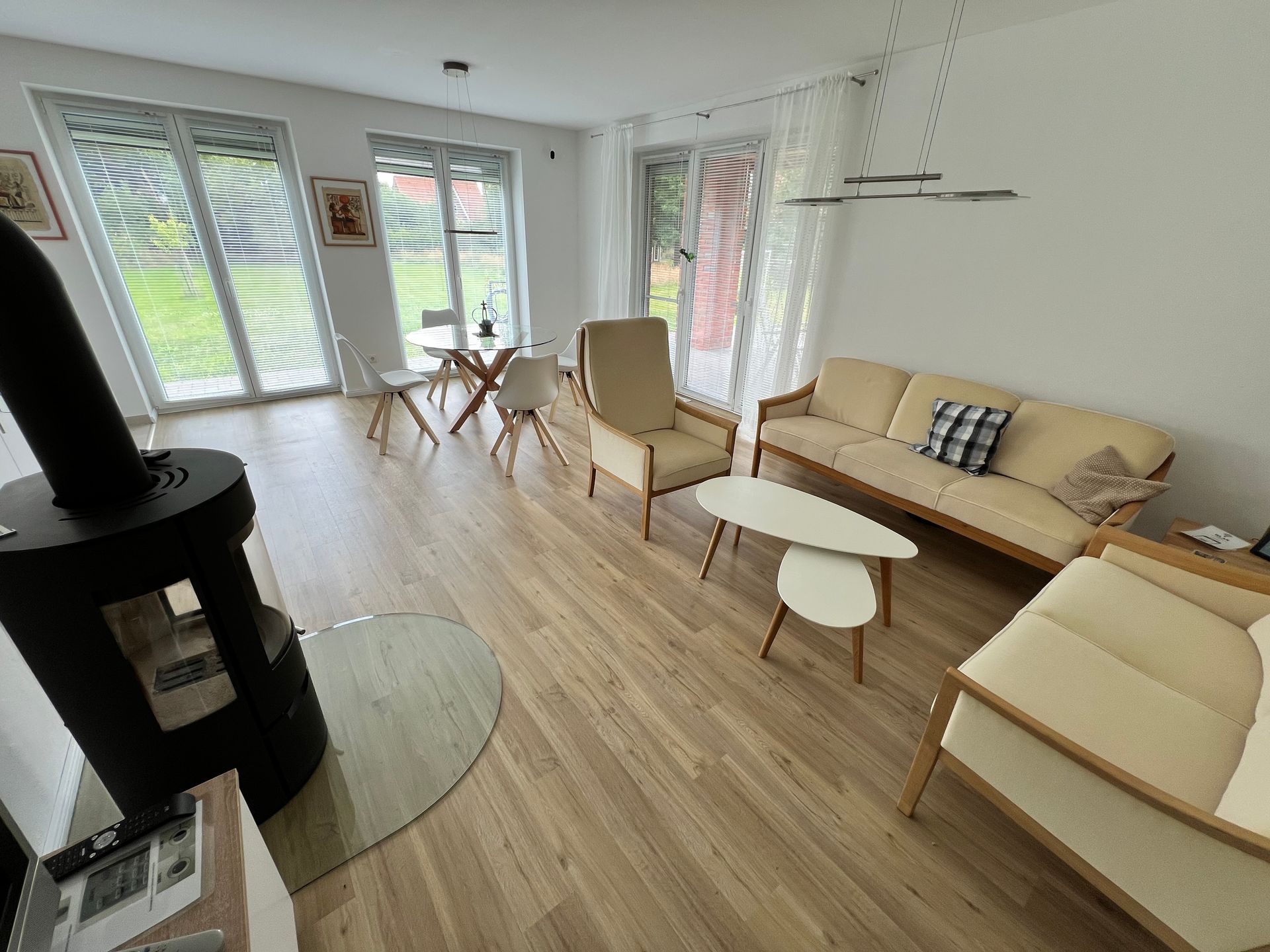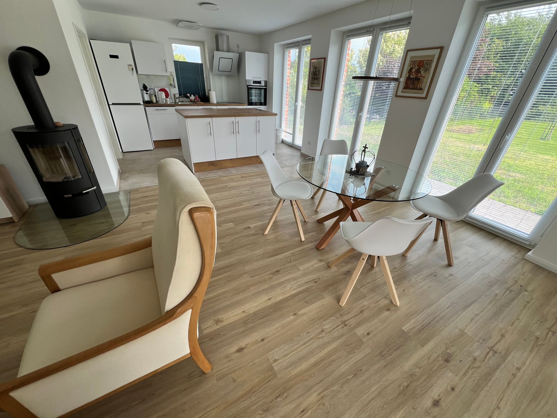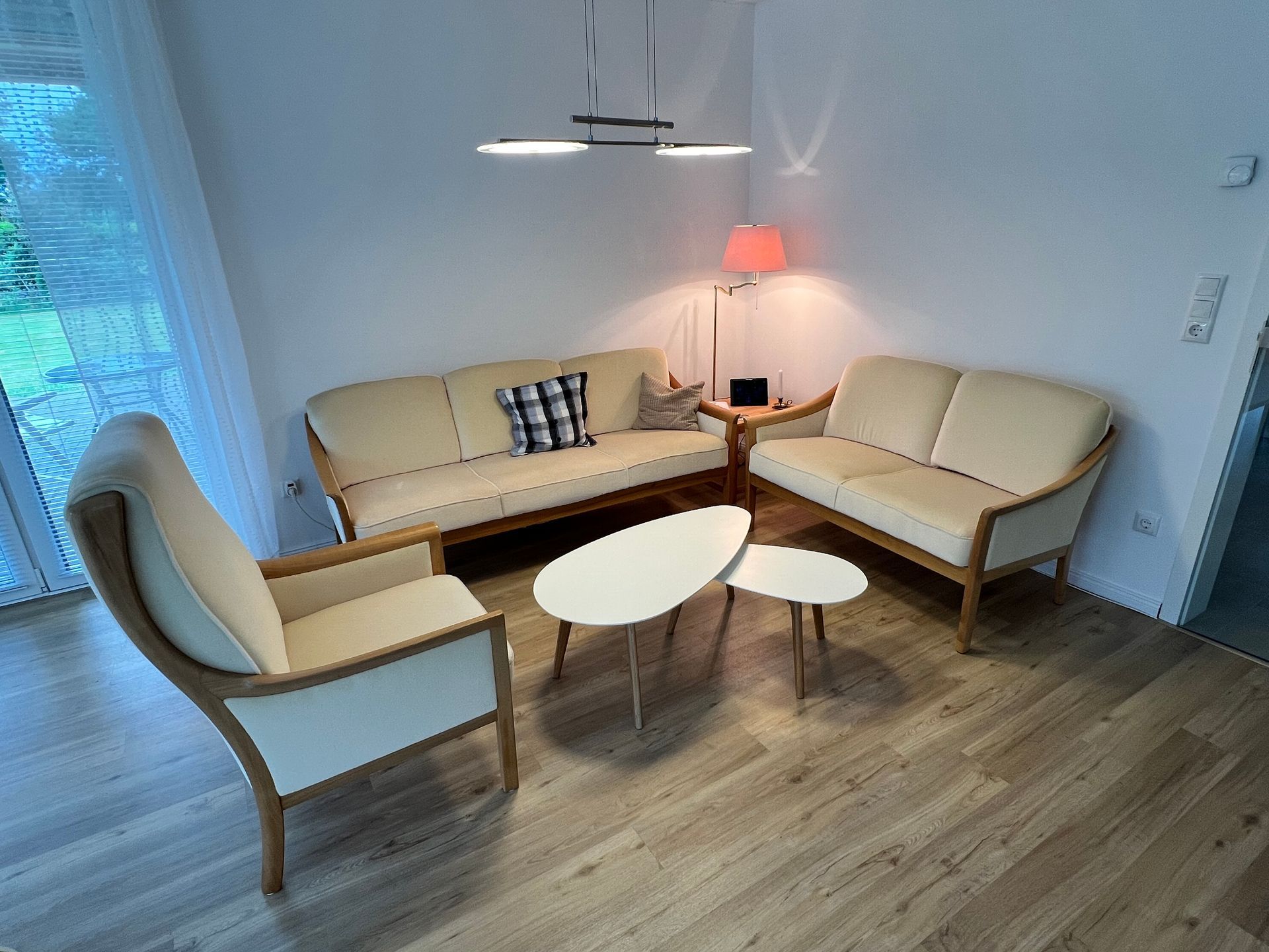 Der Bereich bietet Essecke und eine Sitzecke mit Sofa und Sessel, um abens gemütlich zusammenzusitzen und TV zu schauen.