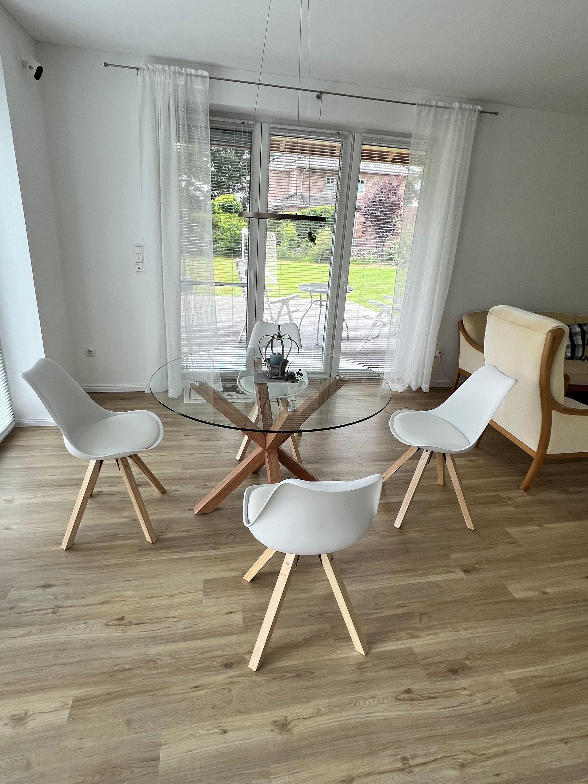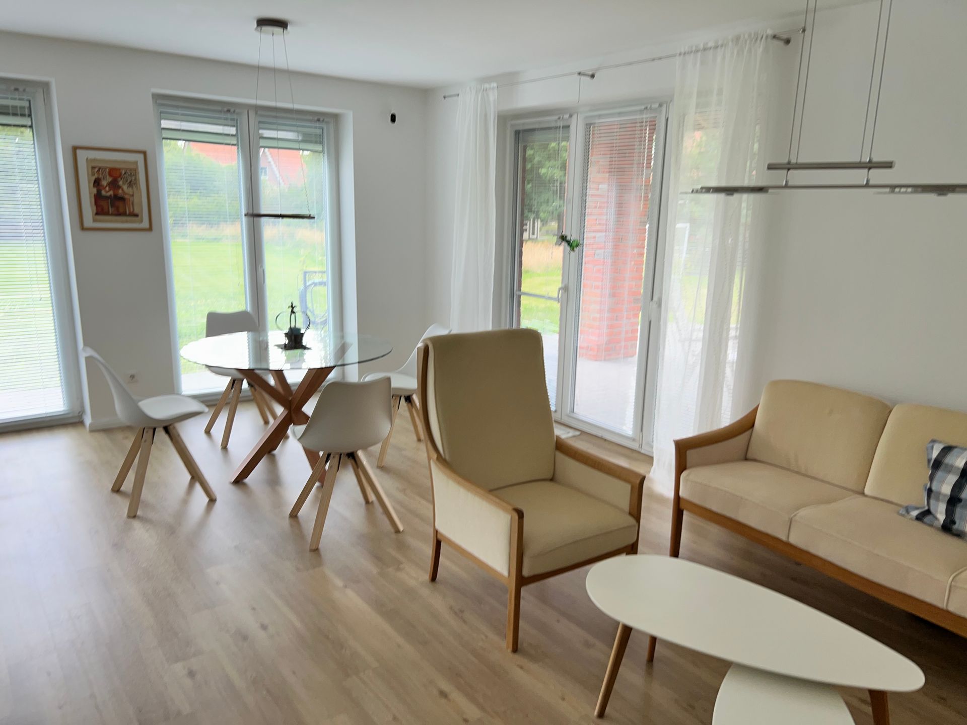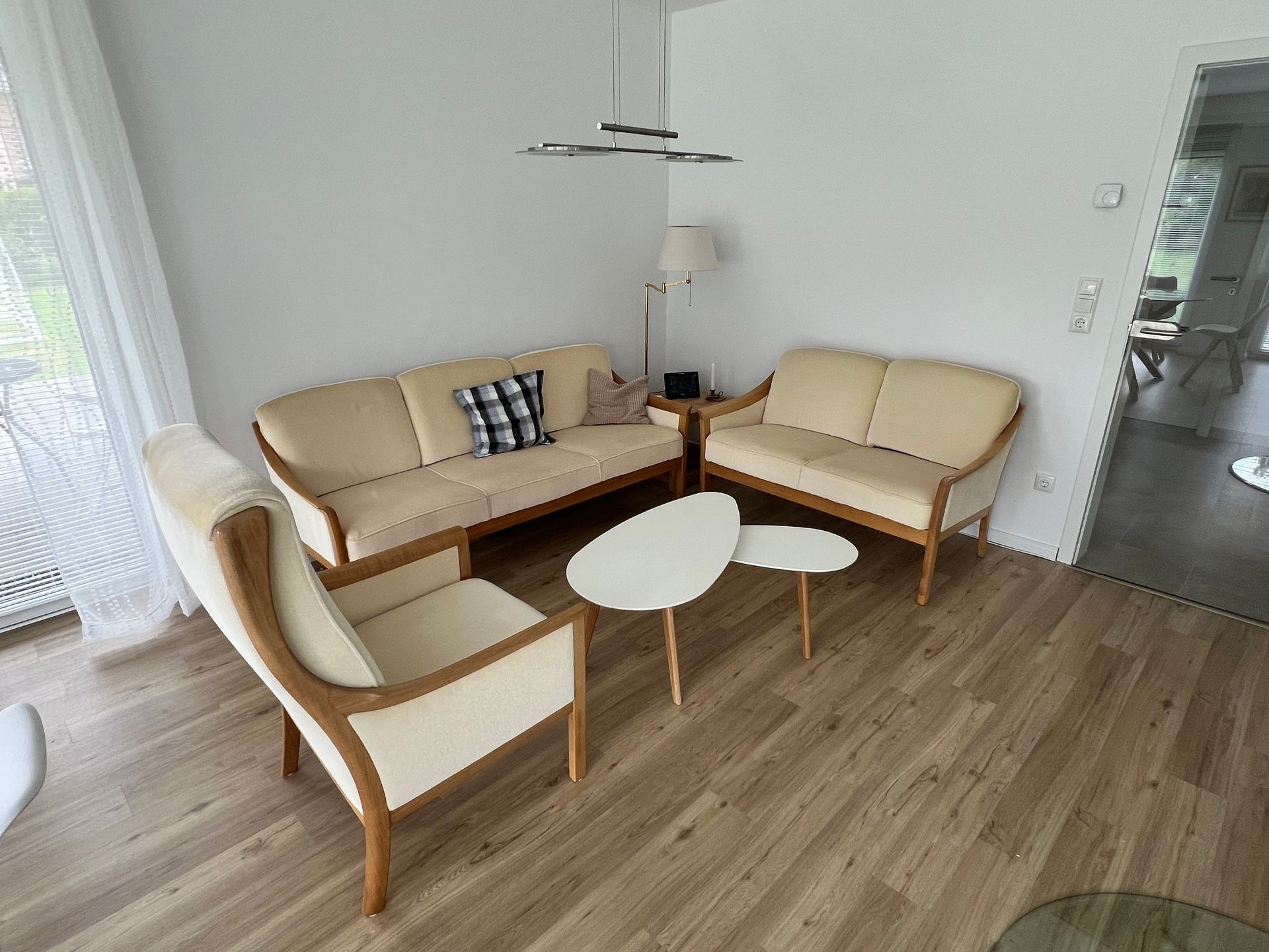 Der Bereich bietet Essecke und eine Sitzecke mit Sofa und Sessel, um abens gemütlich zusammenzusitzen und TV zu schauen.